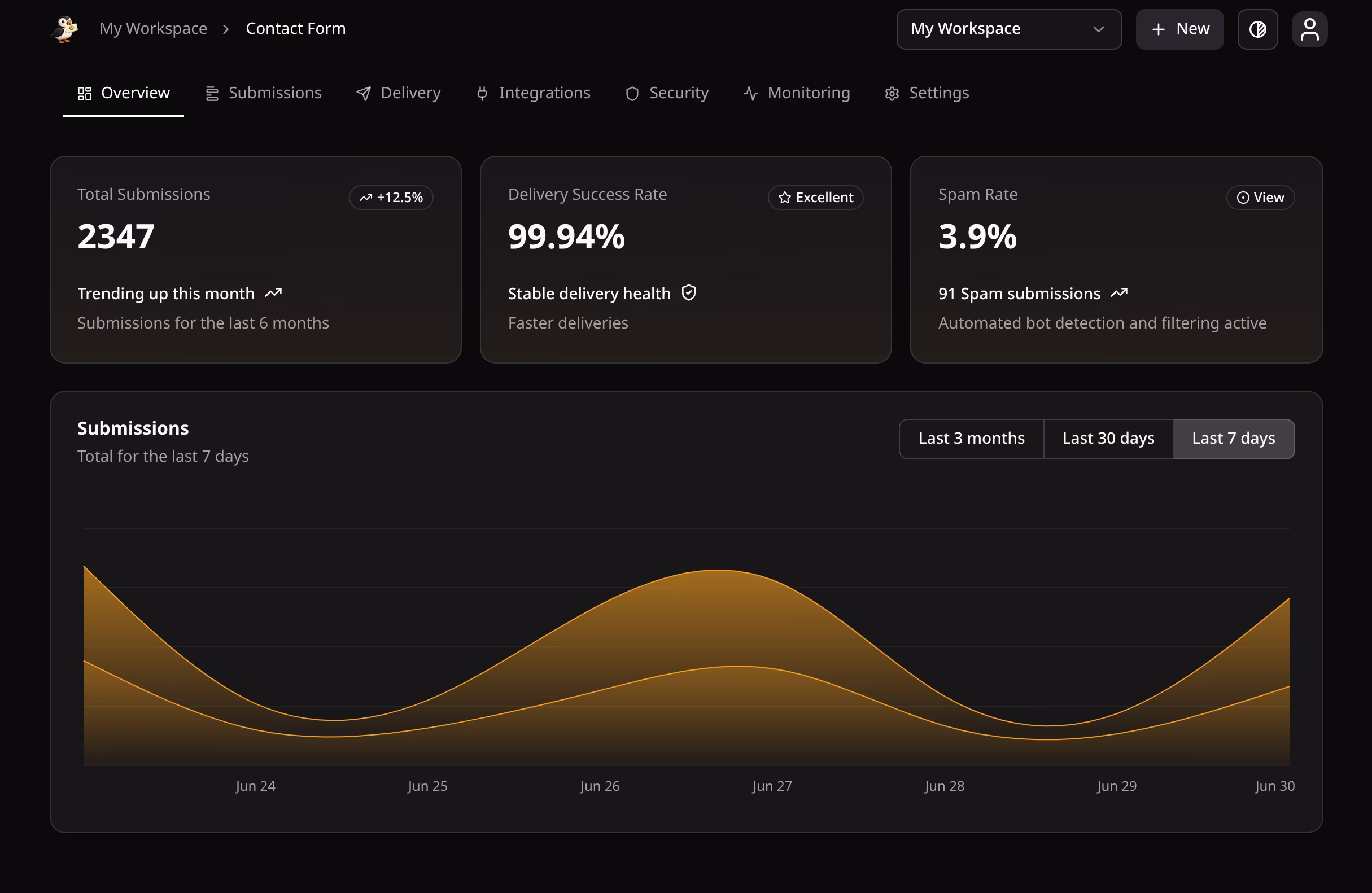 Create, manage, and receive form submissions without building your own backend. AI-powered spam filtering, multi-channel delivery, and enterprise-grade security.